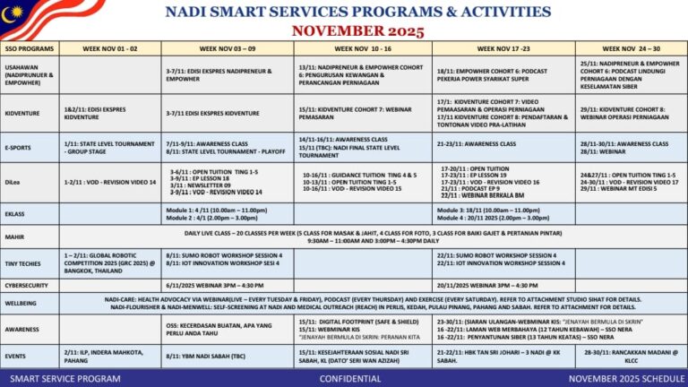 NADI X Nurture DiLea Minggu 1 Bulan November 2025 NADI X Tiny Techies Minggu 1 Bulan November 2025 NADI X Kidventure Minggu 1 Bulan November 2025 NADI X E-Kelas Usahawan Minggu 1 Bulan November 2025 NADI X Kesejahteraan Kendiri Minggu […]