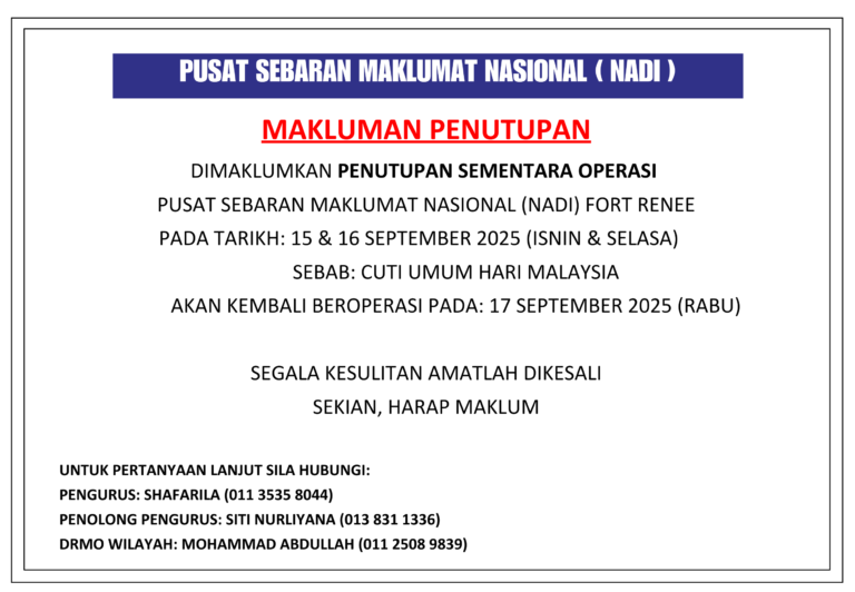 MAKLUMAN PENUTUPAN SEMENTARA OPERASI NADI FORT RENEE 15 & 16 SEPTEMBER SEMPENA CUTI UMUM HARI MALAYSIA